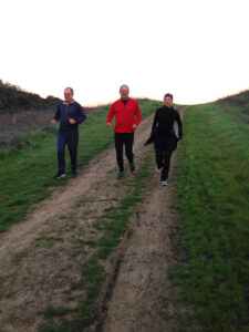 While it might vary, the typical structure is three days a week (M/W/F) of aerobic work—intervals on the track, climbing hills and stairs, and distance running. The other two days of the week (T/Th) are strength training days with light weights, followed by a wide variety of cardio bursts to keep the heart rate up and the body working. Each day incorporates balance work and strengthening of the core.